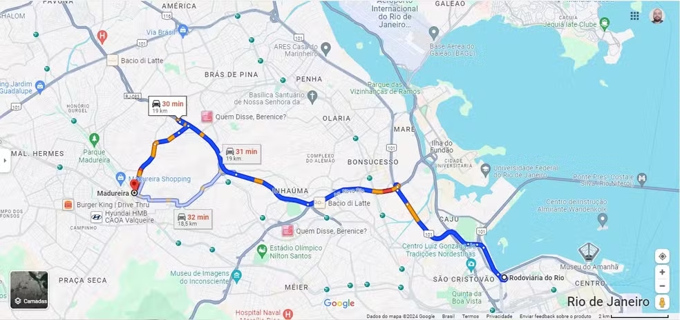 - Trajetos em vermelho: é bom ter atenção, pois simboliza congestionamento ou trânsito parado. Quanto mais escuro estiver o tom do vermelho, mas lenta estará a circulação da via.